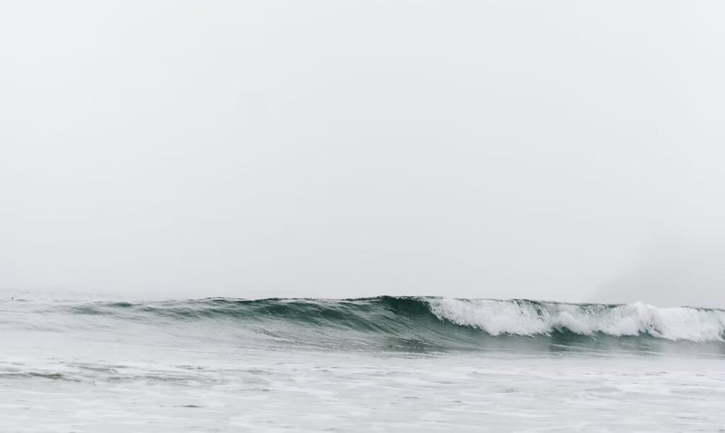 Foam etched swells crack the peacefulness of the chilled air in motion.